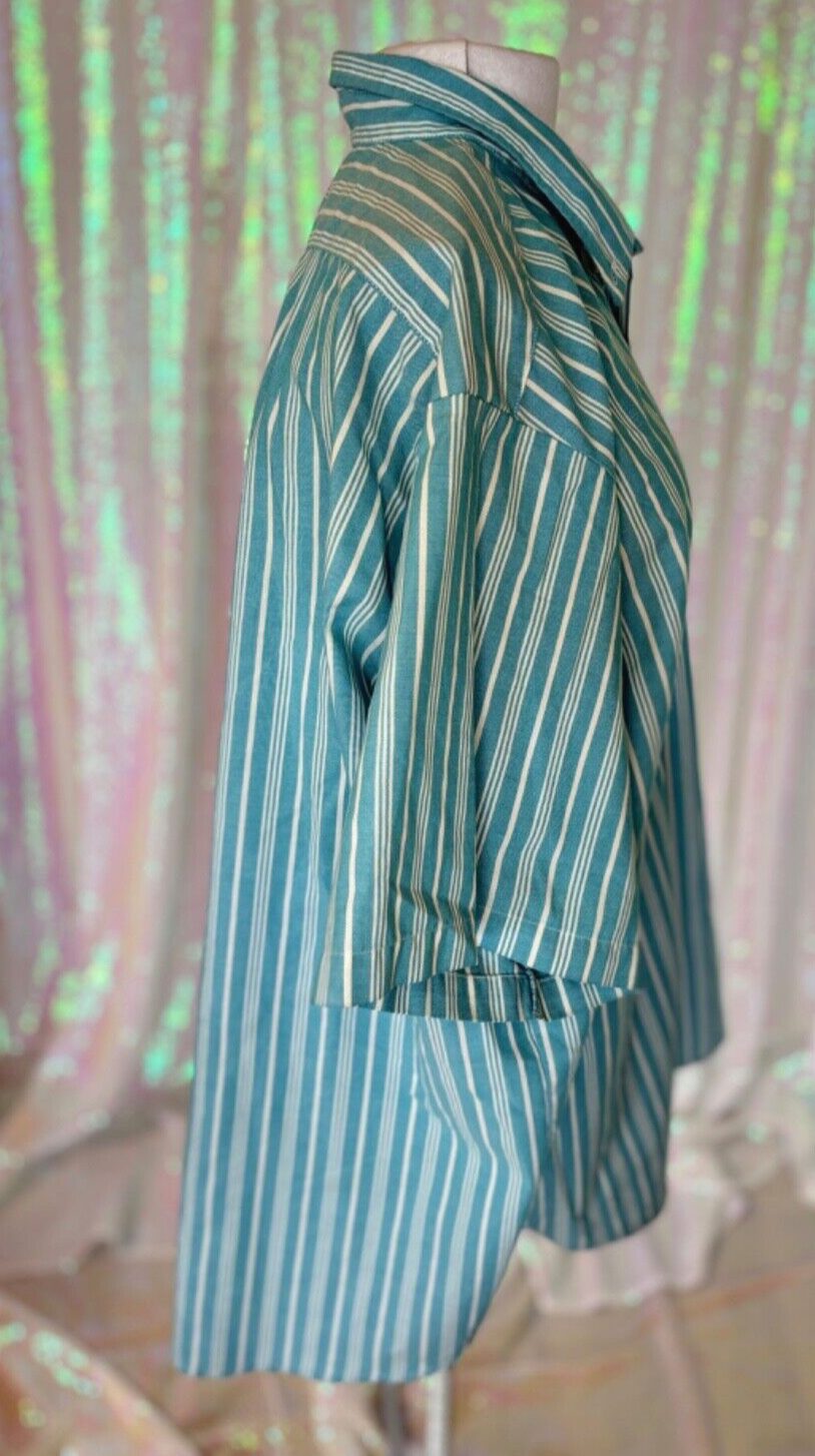 Handmade charm meets bold florals: this vintage blouse is cut from a velvet-like fabric that feels soft with just the right amount of weight. The oversized blue-and-purple rose print pops against a warm background, giving it major retro-lounge energy. Boxy silhouette, short sleeves, and—praise be—pockets. It’s one of those pieces that works as a blouse, a tunic, or even a festival top layered over something slinky. One-of-a-kind and ready to be loved again.